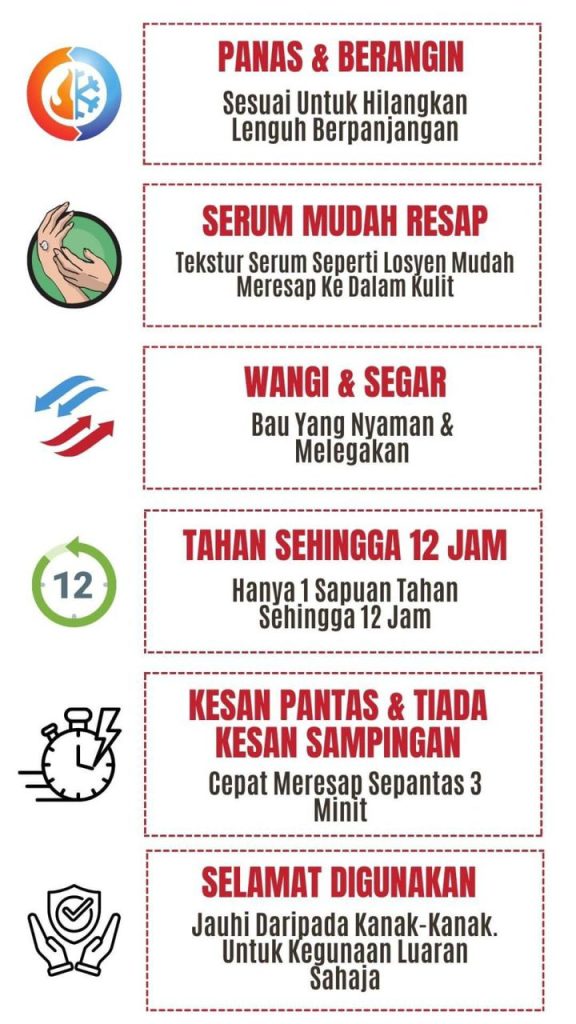“Kesan boleh mula dirasai sepantas 3 minit sahaja selepas sapu (tak melekit), 3X Ganda Lebih Panas. Paling terkejut kebas tangan kaki dan bengkak sendi lutut berkurang, senang ke masjid dapat RAPATKAN SAF SEMULA DAN MATA PUN TERANG NAK MENGAJI sebab rasa hangat extra membantu legakan kesakitan dengan pantas”